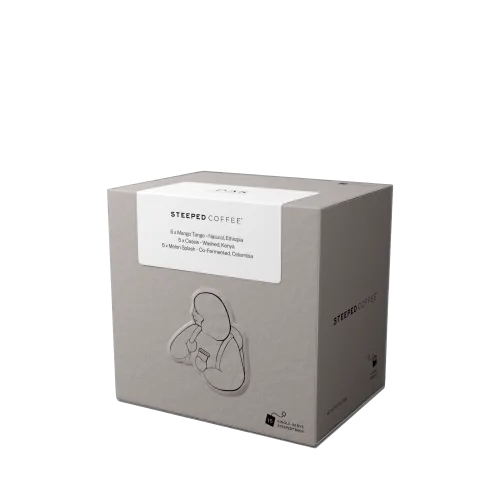 Unlock the flavours of these delicious coffees by simply adding hot filtered water. These brew bags are ideal for home, travels or outdoor adventures without compromising on taste. The box contains 15 Steeped bags (5 bags each of 3 different coffees). In this edition, we have Mango Tango, Cassis and Melon Splash.